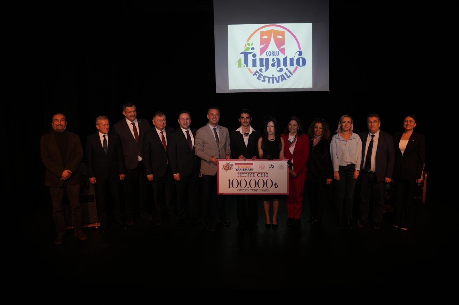Yarışma sonunda dereceye giren okullara toplamda 225 bin TL ödül takdim edildi. Başarıyı teşvik etmek amacıyla; birinciye 100 bin TL, ikinciye 75 bin TL ve üçüncüye 50 bin TL tutarındaki ödülleri bizzat takdim eden Belediye Başkanı Ahmet Sarıkurt, törende yaptığı konuşmada, “Çorlu’muzda kültür ve sanatın kalbinin attığı, tiyatronun ışığının sahneden hayata yayıldığı çok özel bir buluşmada bir aradayız. Bu yıl dördüncüsünü gerçekleştirdiğimiz Çorlu Tiyatro Festivali’nin heyecanını hep birlikte yaşıyoruz. 26 - 30 Mart tarihleri arasında 5 gün boyunca sürecek festivalimizde; tamamı yerel tiyatro grupları tarafından hazırlanan 7 tiyatro oyunu ve 1 atölye çalışması sanatseverlerle buluşacak. Bu yönüyle festivalimiz; yalnızca bir etkinlik olmanın ötesinde, kentimizin kendi sanat gücünü ortaya koyduğu, üretimin ve emeğin sahneye taşındığı çok kıymetli bir organizasyon olacak. Festivalimizin açılışında bizleri onurlandıran kıymetli sanatçılarımız Sayın Cihat Tamer ve Sayın Ferdi Akarnur’a da ayrıca hoş geldiniz diyor, hem sanat dünyamıza hem de festivalimize sağladıkları katkıları için yürekten şükranlarımı sunuyorum” dedi.